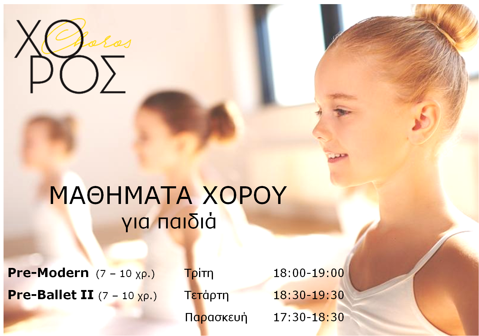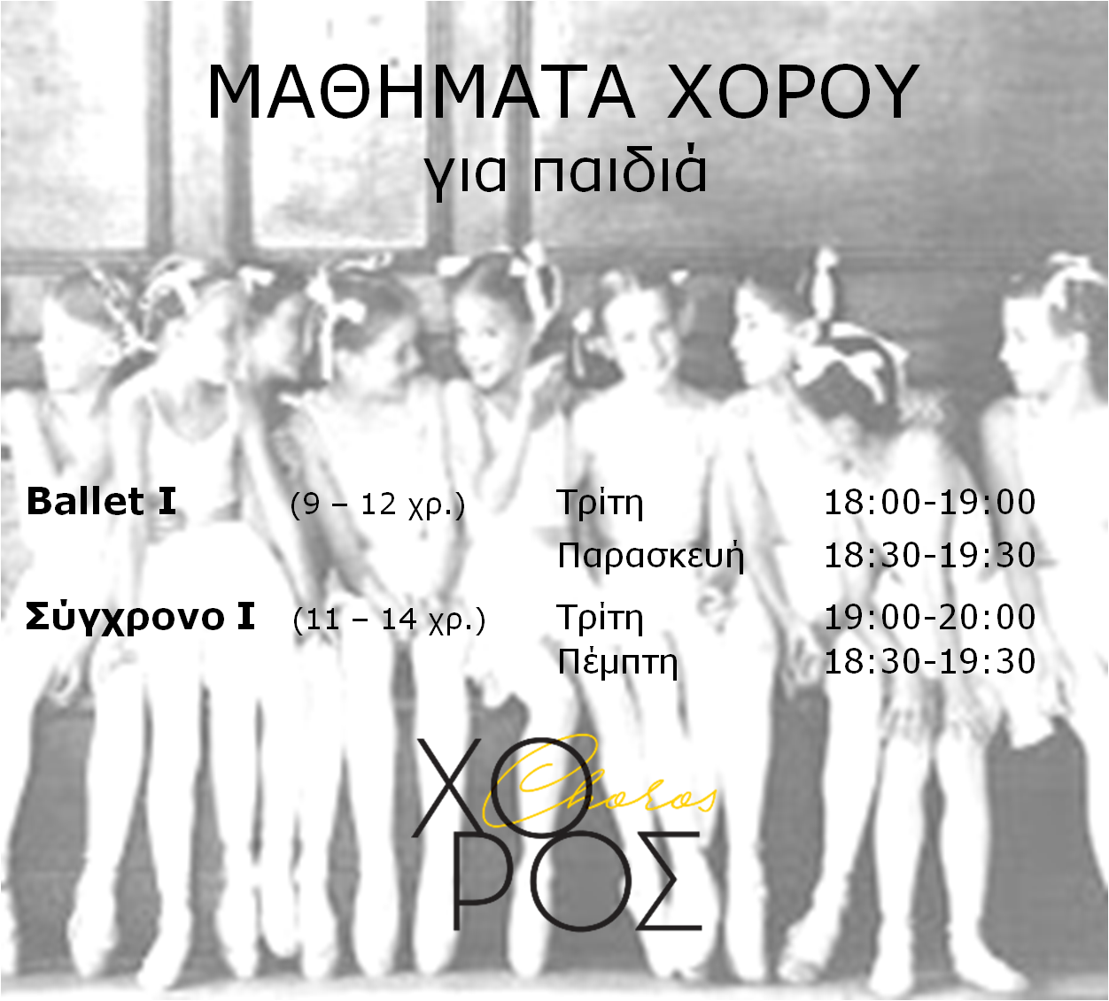 Η Επαγγελματική και Ερασιτεχνική σχολή 'ΧΟΡΟΣ" προσφέρει εξειδικευμένα και προσαρμοσμένα μαθήματα για παιδιά όλων των ηλικιών, καθώς και μαθήματα για ενήλικες, αρχάριους και προχωρημένους, σε έναν χώρο υψηλής αισθητικής, διαμορφωμένο με αυστηρά επαγγελματικά κριτήρια.