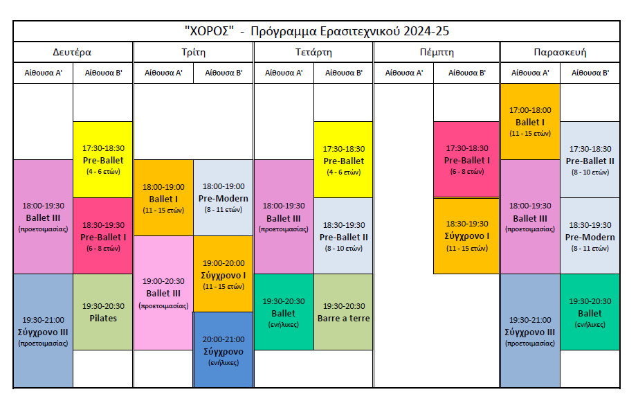 Η σχολή ΧΟΡΟΣ έχει επίσης τμήματα για αρχάριους και προχωρημένους όλων των ηλικιών, σε πολλά είδη χορού και σε όλα τα επίπεδα, όπως το κλασικό μπαλέτο, ο σύγχρονος χορός, ο αυτοσχεδιασμός κ.ά.