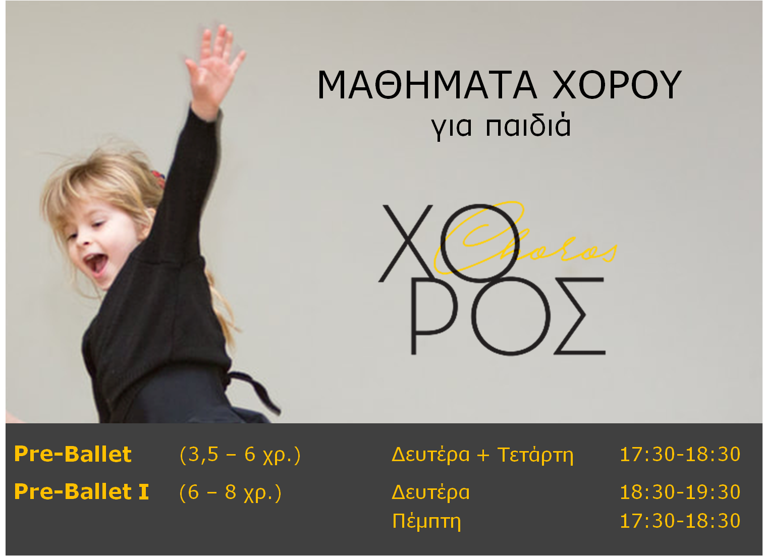 Στη σχολή "ΧΟΡΟΣ" γίνονται δεκτά παιδιά μεγαλύτερα από 4 χρόνων. Στην τρυφερή αυτή ηλικία μπαίνουν οι βάσεις των χορευτικών σπουδών με ένα πλούσιο και ευχάριστο κινησιολογικό μάθημα, μέσα από το παιχνίδι, τον αυτοσχεδιασμό και τις διασκεδαστικές ασκήσεις.